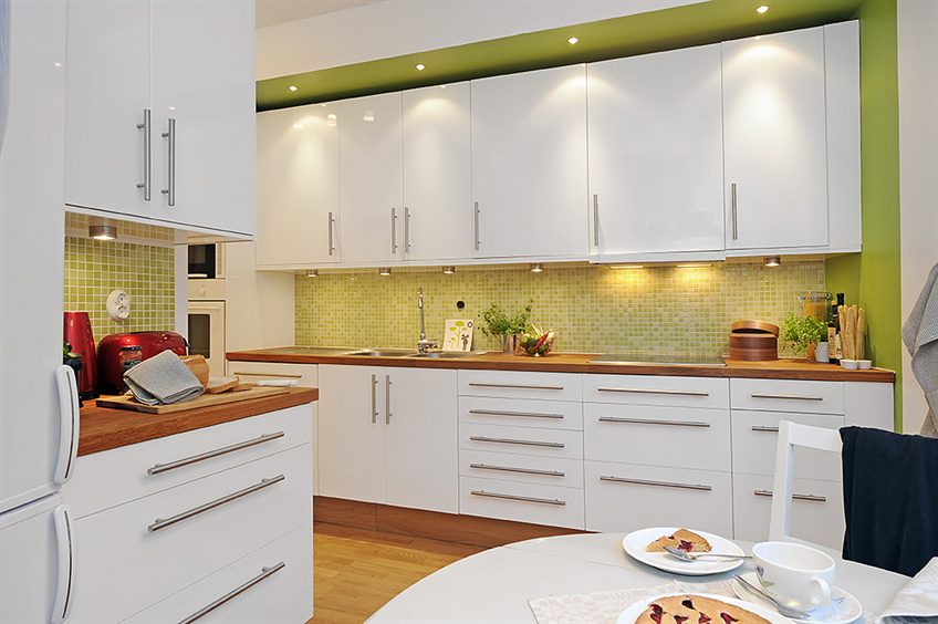 Также рабочую зону на кухне можно покрасить краской. Она тоже должна быть влагостойкость и гигроскопичной. К преимуществам такого метода относятся низкая цена, возможность реставрирования и широкая цветовая палитра. К минусам покраски рабочей зоны на кухне можно добавить: длительную подготовку стен, сложность в уходе и плохую устойчивость к механическим повреждениям.