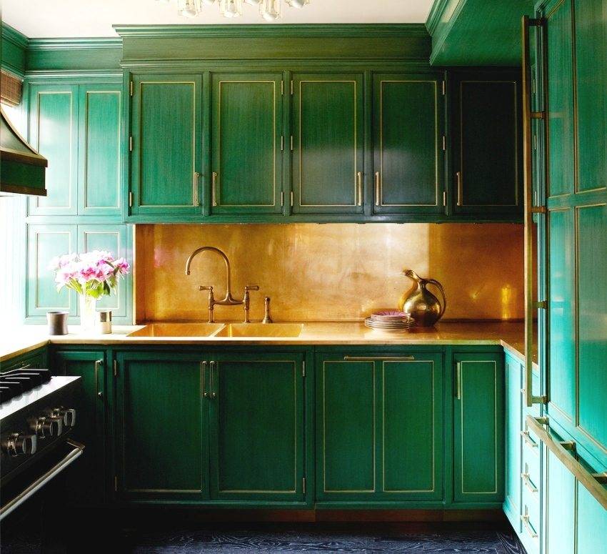 Стена над рабочим столом в подобном цветовом изыске создаст в интерьере повышенное настроение. Ему в поддержку подбирают различные аксессуары: шторы, ручки шкафов, полотенца;