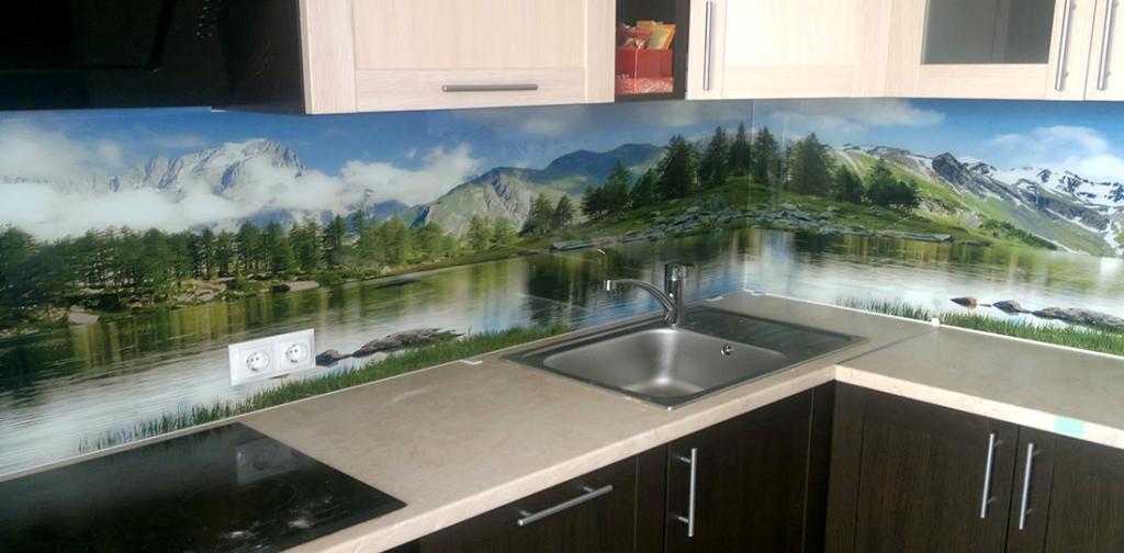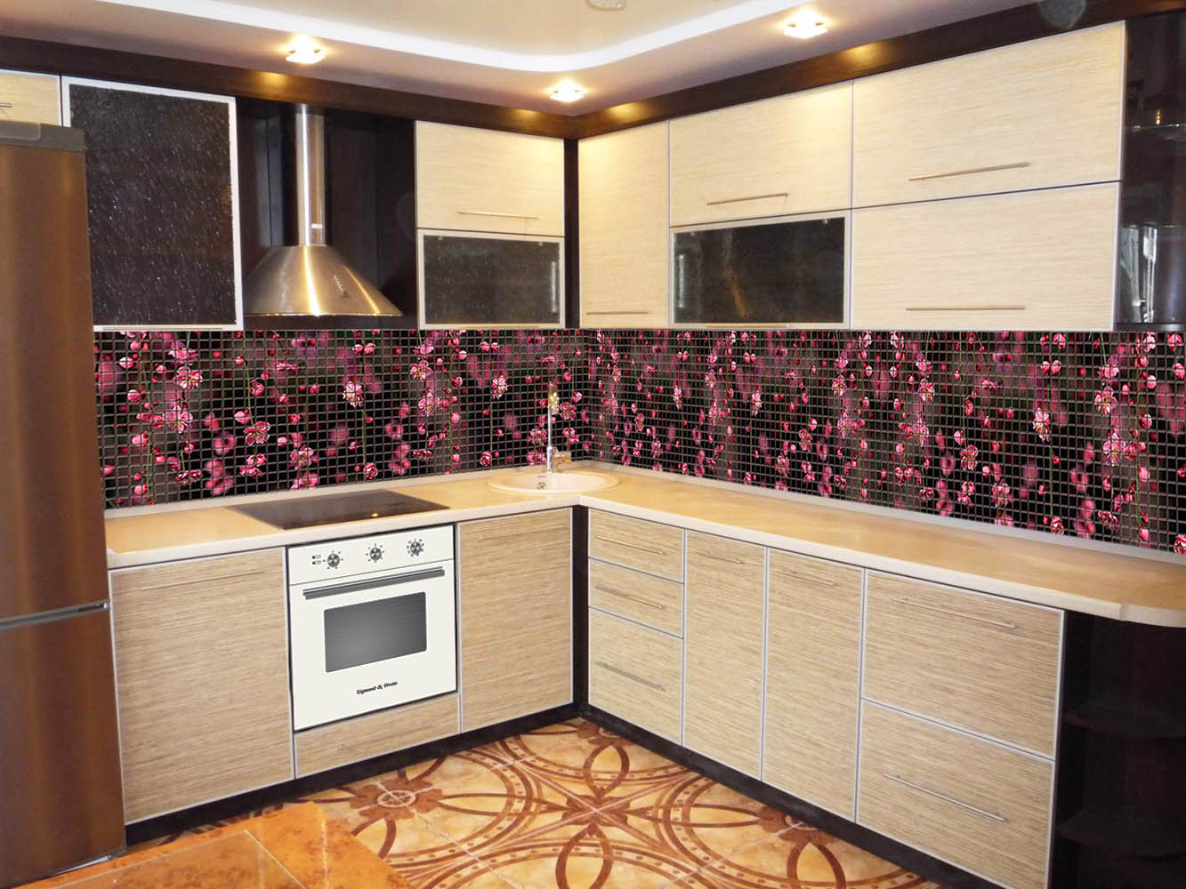 - Широкий выбор дизайнерского оформления. На триплекс можно нанести абсолютно любой рисунок, что позволит создать уникальный фартук и сделать кухню особенно уютной. Если вопрос о том, какой сделать фартук на кухне, стоит очень долго и никак не разрешается, скинкали тоже будет прекрасным вариантом: на стену у рабочей зоны достаточно будет установить прозрачную стеклянную панель, сквозь которую будут хорошо видны обои.