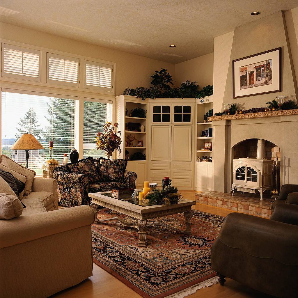 В ней размещается большое количество состаренных мебельных предметов: просторный диван, кресла, журнальный столик, пуфики и тумбочки. Подчеркивает деревенскую простоту в гостиной изящный камин, возле которого располагается плетеное кресло.