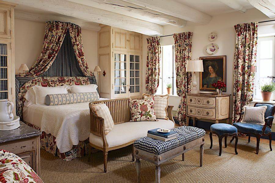 Здесь важную роль играет текстиль: над кроватью вешается элегантный балдахин, постель застилается покрывалом с воланами, рюшами или кружевными вставками. Сверху покрывала укладываются многочисленные декоративные подушки.