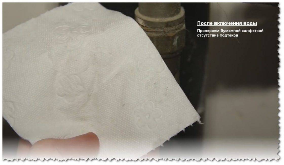 Прежде чем пользоваться водоснабжением, нужно убедиться в герметичности соединения. Проверяем с помощью бумажного полотенца: