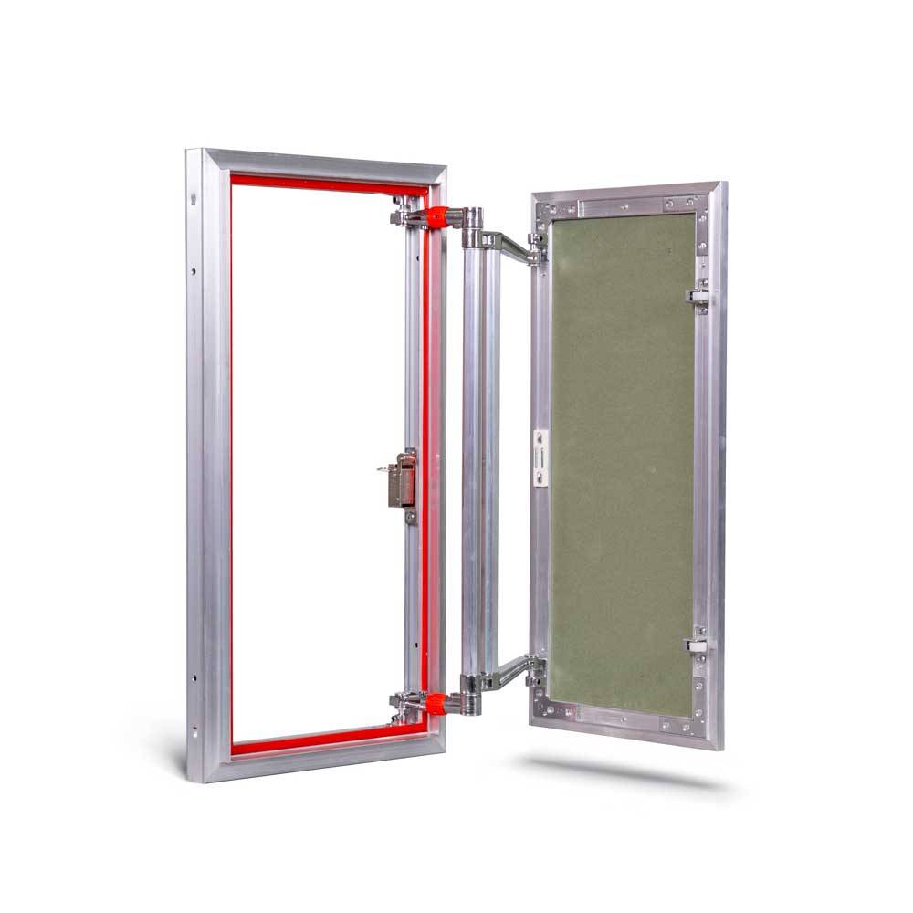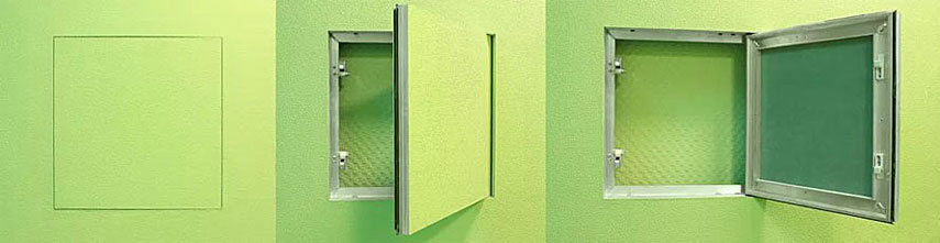 Характерная их особенность – способность створки выдвигаться вперед, а затем – распахиваться при помощи петель. Часто, для удобства, они снабжены специальными присосками, но могут иметь и магнитно-нажимные замки. Для доступа к ним требуется достаточное пространство, поэтому их монтаж возможен на относительно свободных стенах. Отличаются простотой монтажа и обеспечением легкого и свободного доступа к коммуникациям.
