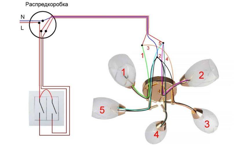 С двойным выключателем работают при таких условиях: наличие трех проводов в потолке (2 фазы и ноль) и такого же количества – в люстре. Сам прибор освещения обычно содержит несколько лампочек. Ноль люстры стыкуют с общим нолём сети, каждую секцию ламп – с фазными проводниками. Все скрутки изолируют, закрывают в клеммной коробке.