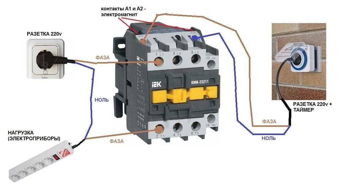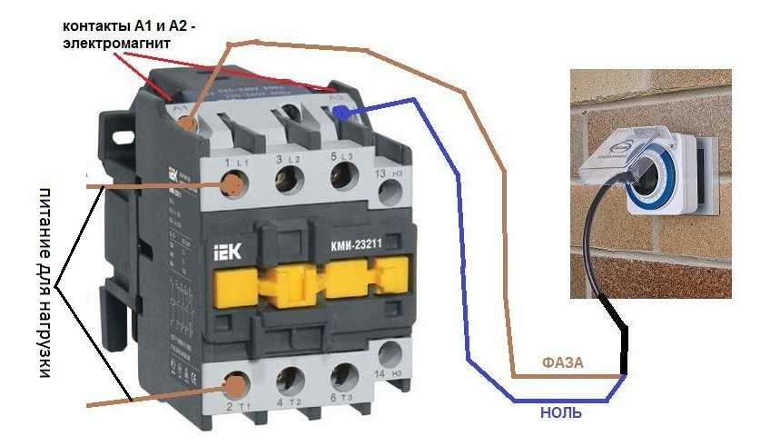 Но, как вы понимаете, такая схема подключения магнитного пускателя не особо удобна — можно и напрямую проводники от источника питания подать, встроив обычный рубильник. Но есть гораздо более интересные варианты. Например, подавать питание на катушку можно через реле времени или датчик освещенности, а к контактам подключить линию питания уличного освещения. В этом случае фаза заводится на контакт L1, а ноль можно взять, подключившись к соответствующему разъему выхода катушки (на фото выше это A2).