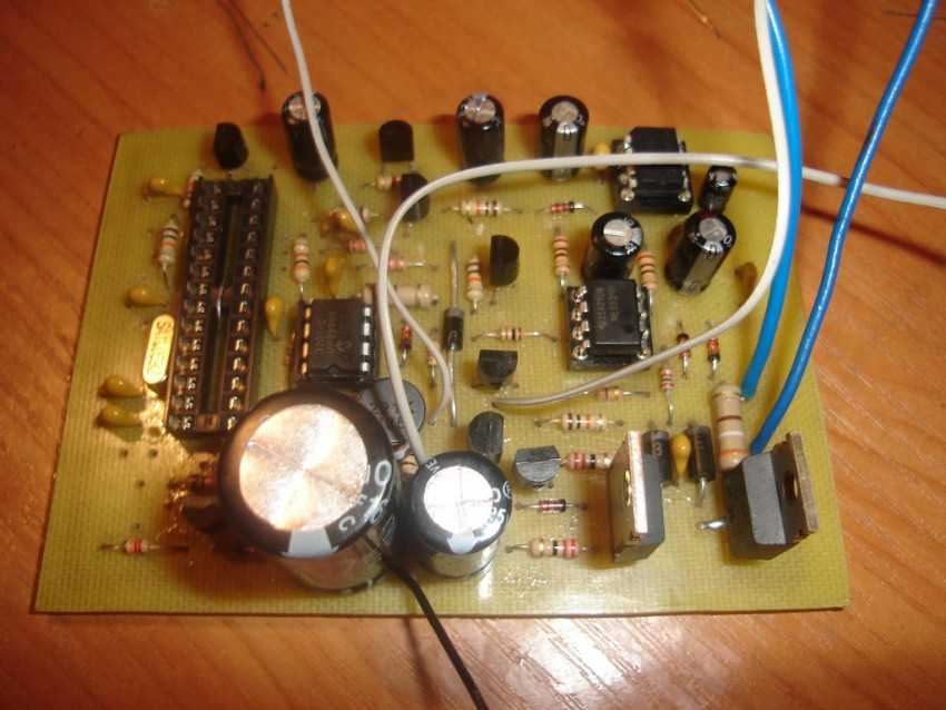 Работы следует начинать с установки необходимой микросхемы, которая выступает в качестве контроллёра на обустраиваемый теплоотвод, производимый из платины. Помимо этого на него устанавливаются симисторы. Затем на плату монтируются светодиоды мигающие.