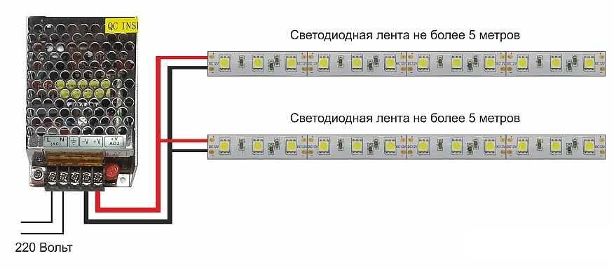 Рассмотрев подключение светодиодной ленты (220В), следует уделить внимание схеме с двумя такими осветителями. Их нельзя подключать последовательно