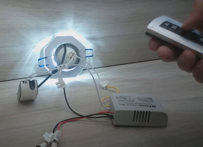 Контроллер с антенной размещают в корпусе осветительного прибора, в полости потолка возле подвеса или в монтажную коробку. Питание осуществляется от сети 220 В. Стационарный пульт закрепляется на стене и оборудован звуковым поиском дистанционного регулятора.