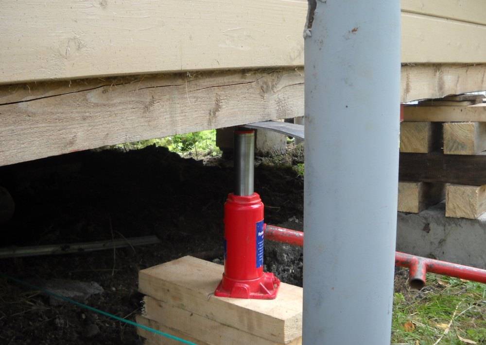 Домкратом немного приподнимают сруб. За один раз всего 2-3 см