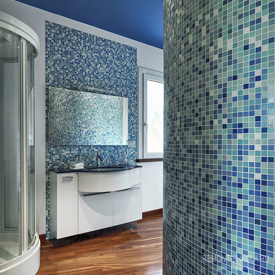 Полы также сделаны синими. Кажется, что затирка на них темнее основного тона, но это не так. Контраст достигается за счет соответствующего окраса самой плитки.