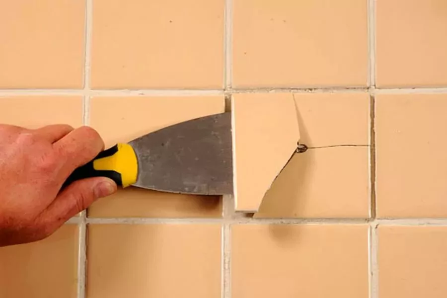 Шаг 4. Плитка начинает крошиться и отходить от основания. Так действовать придется в местах, где плитка очень плотно прилегает к сантехнических элементам, которые нужно сохранить.