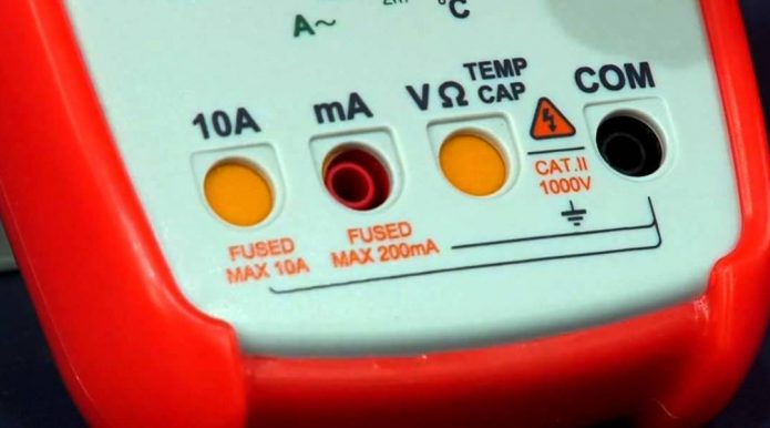 Провода с щупами, которыми нужно коснуться детали при измерении, подключаются к соответствующим разъёмам. Чёрный провод всегда к гнезду с обозначением COM, а красный — в зависимости от величины тока. Если он не превышает 200 мА, то к разъёму VΩmA, если превышает, то к 10ADC (10A MAX). В быту такие высокие токи не встречаются, поэтому в основном используется гнездо VΩmA.