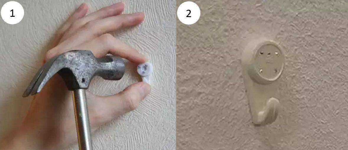 Это устройство представляет собой пластиковый крючок, в основании которого имеется четыре гвоздика из хорошей стали. Прикладываете крючок к стене и молоточком средних размеров аккуратно забиваете гвоздики в стену.