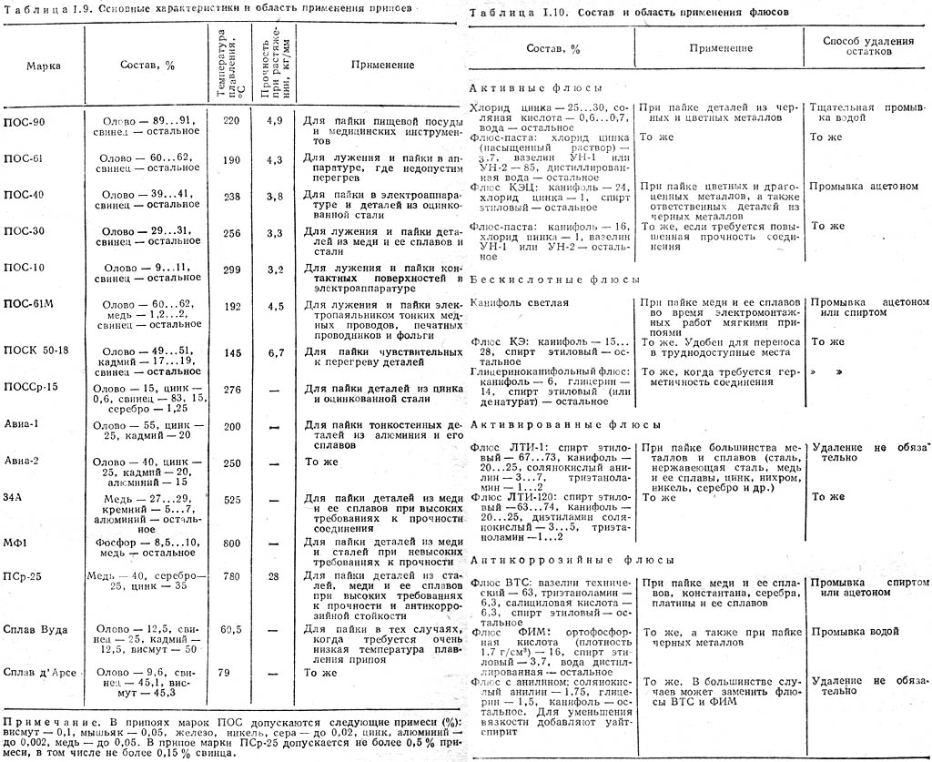 Теперь пришло время точно подобрать рабочий припой и флюс к нему, т.к. пайка, в отличие от полуды, должна не только крепко сцепляться с основным металлом, но и сама быть прочной. Сводка сведений о припоях и флюсах широкого применения из старого справочника дана на рис. Применительно к нынешнему времени к ней остается добавить не так уж много.
