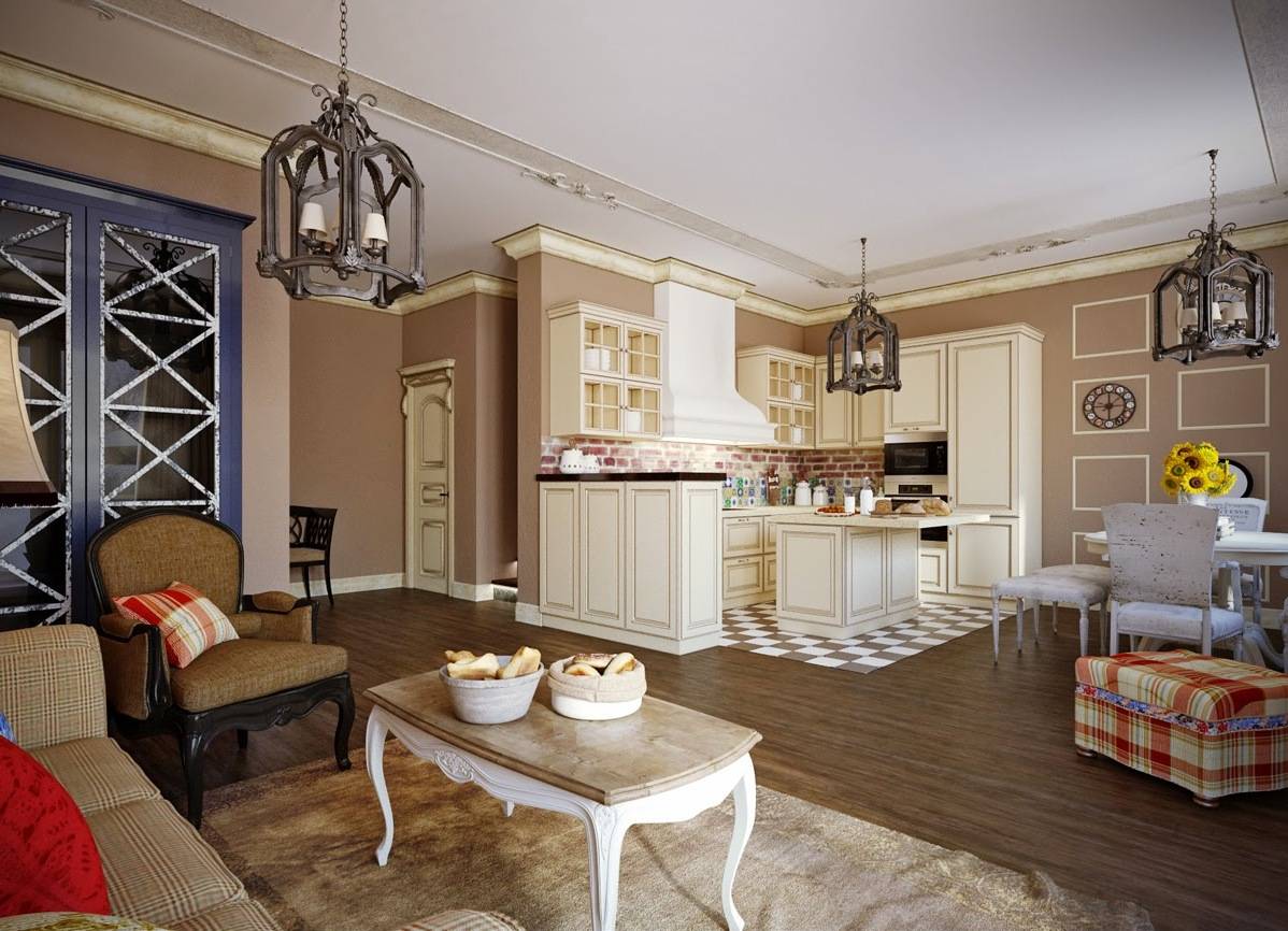 Очень важна также система освещения. Света должно быть достаточно и в гостиной, и в рабочей зонах, поэтому специалисты рекомендуют использовать одну люстру и множество точечных светильников непосредственно на самой кухне, а также большую люстру прямо над обеденным столом и несколько источников света по всей гостиной (это могут быть элегантные бра на стенах).
