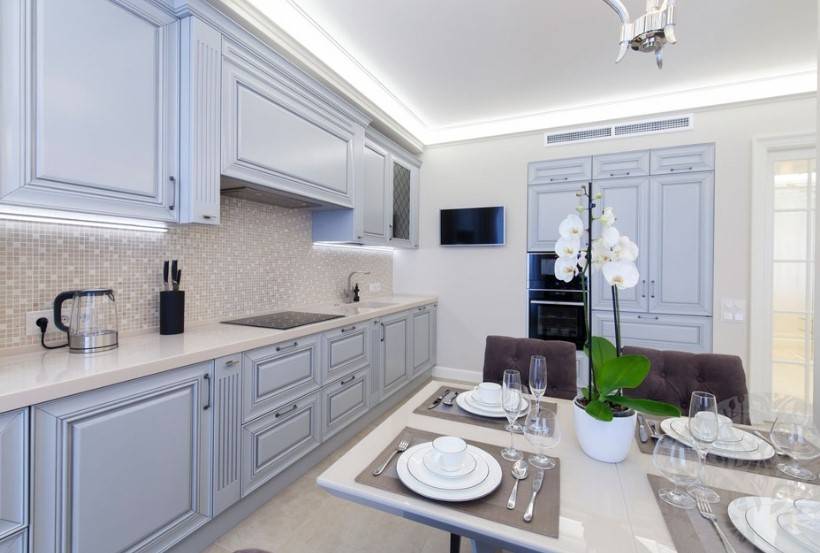 Планировки кухонь в этом стиле являются самыми компактными и универсальными. Их несложно спроектировать, при этом использование выступов и ниш в этой схеме отсутствует, поскольку все шкафы находятся в одной линии. Именно по этой причине кухонный гарнитур имеет дополнительное преимущество – низкую стоимость.