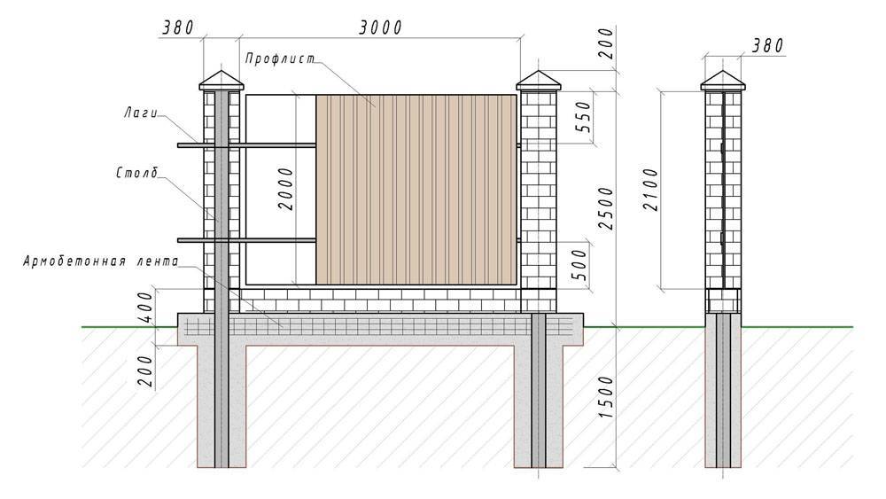 Если для забора в качестве опоры была выбрана профилированная труба, то ее можно использовать любого сечения, как правило, выбирают размеры 50х50, 60х60 или 70х70 мм, стенки должны быть толщиной не менее 3 мм.