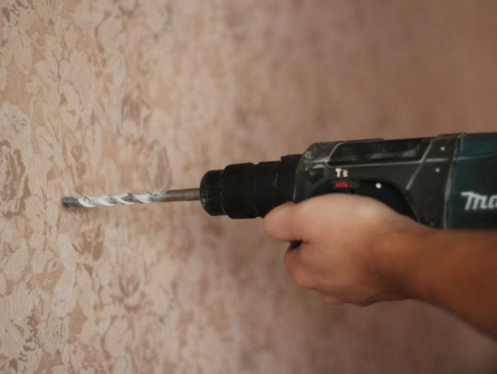 Обычной дрелью сверлить бетонную стену трудно. Нужно установить победитовые свёрла и выбрать малые обороты. В нужное место вставляется дюбель, чтобы помочь инструменту пробить поверхность. Далее сверление нужно чередовать с ударами по дюбелю.
