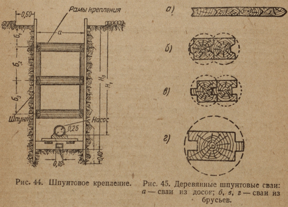 Для крепления котлованов в грунтах, насыщенных водой (жижа и плывун), применяется так называемое шпунтовое ограждение. Шпунтовое ограждение состоит из сплошного ряда вертикально установленных шпунтовых труб или досок (в которых, в одной кромке сделан паз-шпунт, а на другой — гребень), прижатых к стенкам траншеи или котлована горизонтальными рамами с распорами (рис. 44). Все, что было сказано о распорах в вертикальном креплении, относится целиком и к шпунтовыми ограждением заключается в том, что при шпунтовом ограждении сначала забивают шпунт, а затем уже производится рытье траншеи с постепенной установкой распорных рам; в вертикальном же креплении сначала выкапывается траншея или котлован, а затем устанавливается крепление, постепенно опускаемое вниз по мере дальнейшей разработки грунта. Доски шпунта забиваются на глубину, несколько большую (на 0,2-0,5 м) глубины траншеи или котлована, для того, чтобы после окончания рытья нижние концы их не могли быть сдвинуты напором грунта.