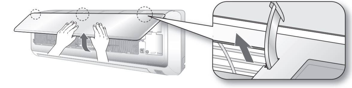 Для очистки настенного блока вам понадобится мягкая влажная тряпочка. Протрите декоративную панель кондиционера, а затем поднимите ее так, как это показано на рисунке ниже.