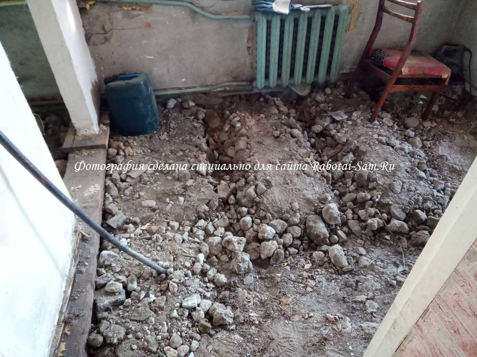 ШАГ 4: демонтаж деревянного пола. Теперь переходим к самому интересному, а именно к демонтажу деревянного перекрытия старого пола. Здесь придется изрядно попотеть, и лучше сразу пригласить напарника (а лучше двоих) для совместной работы