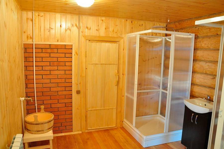Помывочная с душем в бане на даче или в частном доме предусматривается на этапе проектирования. Это позволит избежать многих проблем, например, с устройством водоотвода. Отделочный материал подбирают исходя из вкусовых предпочтений. Душ в деревянной бане предполагает обработку стен антисептиком и грунтование водостойким составом. Облицовка производится натуральной и пластиковой вагонкой. Пластик менее привлекателен, но влаго- и пароустойчив. Чаще применяется для обшивки поверхностей, когда устанавливается душевая кабина или металлический поддон. Так же встречается искусственный камень и кафель.