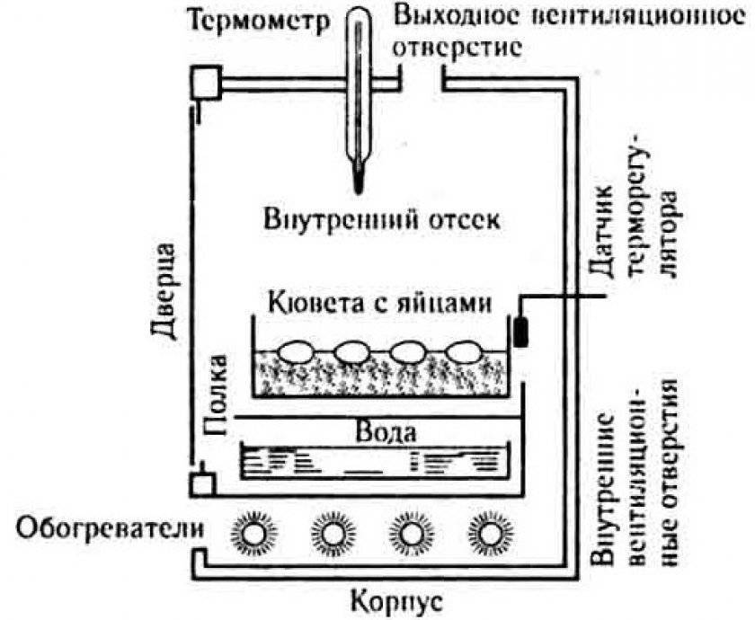 Имеющие в наличие щели обязательно заделывают герметизирующим средством. В инкубаторе должно быть специально выделенное место под емкости с водой (они помогают поддерживать влажность на необходимом уровне). Для поддержания температурного режима берут лампы, имеющие мощность в 25Вт (1 штука) их количество 4 – 5 штук
