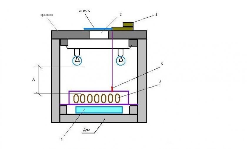 - В нем делают 4 отверстия. В три из них вкручивают патроны для лампочек накалывания, которые играют роль нагревательных элементов. Что касается четвертого отверстия, то оно используется для подогрева воды. Для обогрева камеры рекомендовано использовать лампочки, которые имеют мощность не выше 25 Вт.