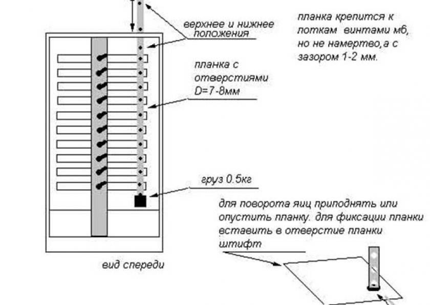 На каждом отсеке должна быть отдельная ручка, благодаря которой каждый лоток можно будет поворачивать из стороны в сторону. Для поддерживания необходимой температуры в инкубаторе нужно реле, работающее от сети в 220 В или термометр ТПК.