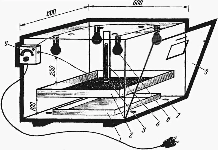 - Терморегулятор, лампочки и вентилятор вмонтируйте в нижней части стенки, чтобы воздух от вентилятора нагревался от лампочек.