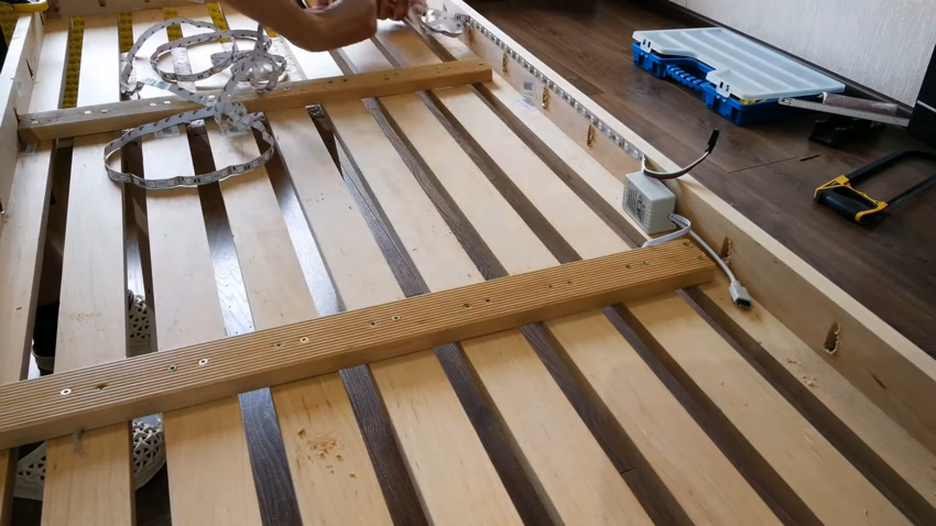 | 9 | ![]() | Пройдитесь наждачной бумагой по боковым частям изголовья, после чего приклейте светодиодную ленту к верхней части реек с внутренней стороны (по желанию). Переключатель посадите на клей. |
