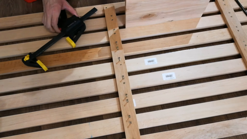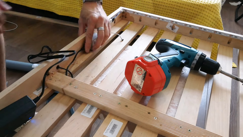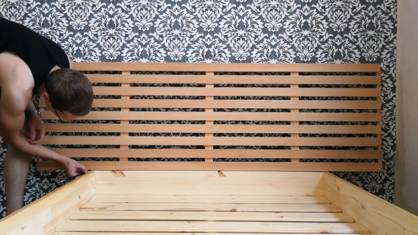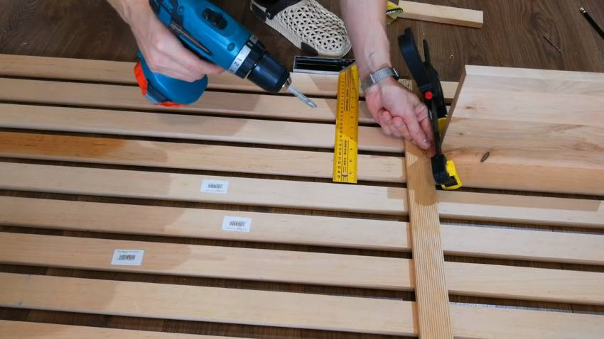 | 7 | ![]() | В другой отдельной доске сделайте несколько углублений сверлом и прикрепите ее к нижней части изголовья, вкручивая саморезы в проделанные отверстия. |