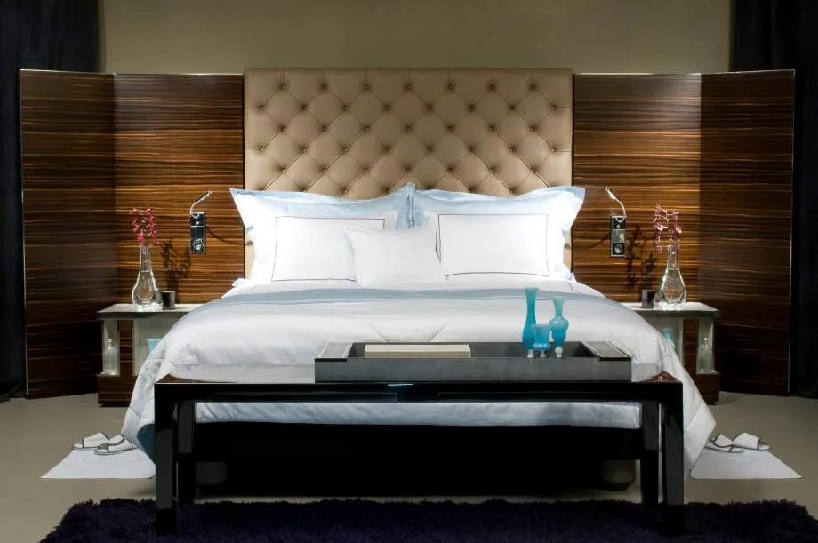 2. Материал для обивки. Это может быть ткань, как простая хлопковая или льняная, так и богатая велюровая — все зависит от общего стиля оформления спальни. Кроме того можно использовать кожу или более экзотические материалы.Однако стоит помнить, что в спальне уместны экологичные и «комфортные» материалы.