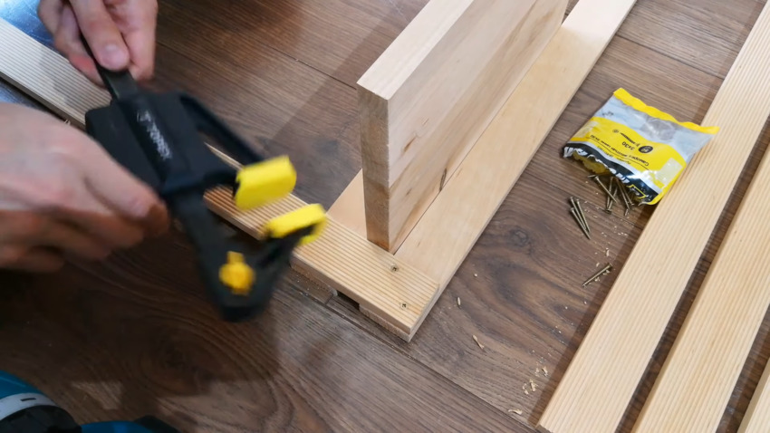 | 8 | ![]() | К другой стороне конструкции приложите другую рейку, сделайте на ней отметки карандашом напротив каждой из досок и вкрутите саморезы в этих местах, предварительно просверлив углубления. То же самое проделайте с двумя оставшимися сторонами и зафиксируйте углы со всех сторон шурупами. |