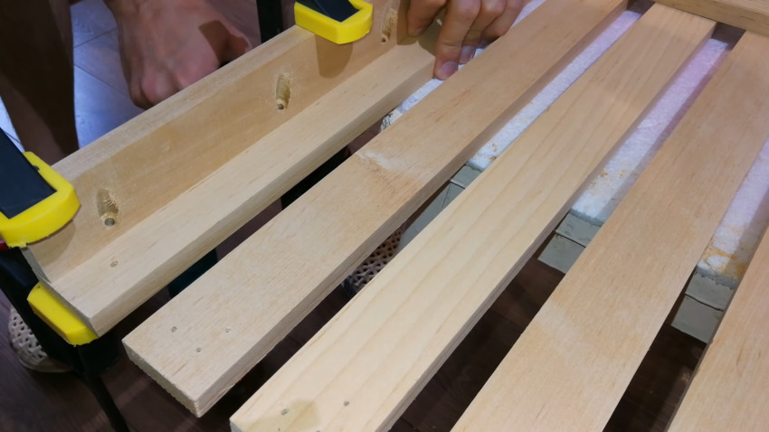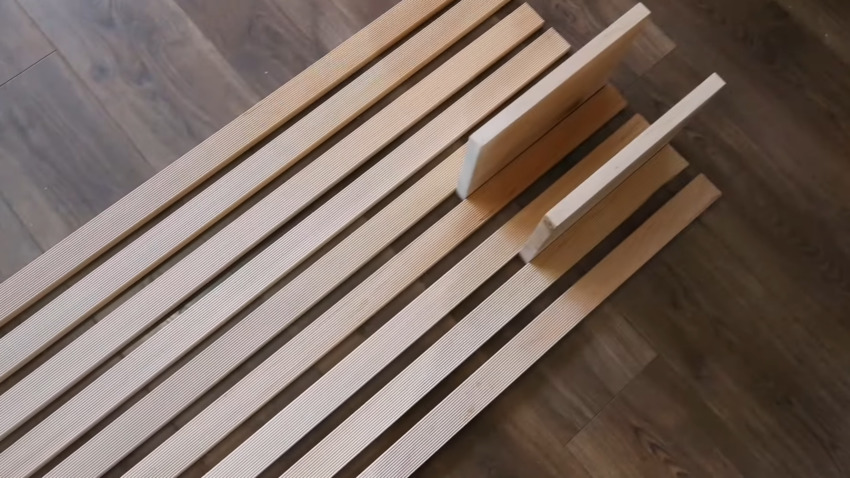 | 2 | ![]() | Для изготовления изголовья подготовьте длинные тонкие рейки (можно рифленые). Разложите их на рабочей поверхности и вставьте полки с каждой стороны для наглядности. |