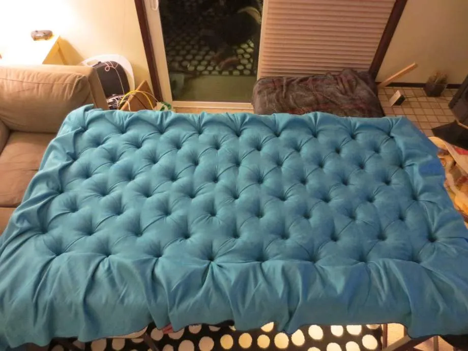 - Натягивание чехла и пришивание декоративных пуговиц для создания стяжки.