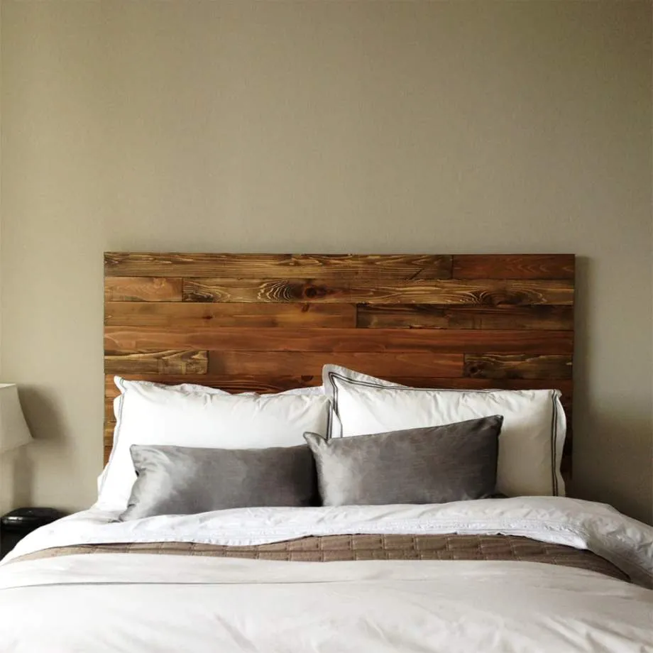 Дерево — это универсальный материал, который подходит к любому стилю. Работать с ним очень легко и приятно, а выглядит оно всегда уместно и натурально. Давайте сделаем деревянное изголовье с эффектом старины. Для этого вы можете использовать что угодно – просто деревянные доски, может у вас есть спилы различных размеров, может, старая деревянная дверца или ненужные поддоны. Мы будем делать обожженное дерево, можно также его покрасить, можно просто вскрыть лаком, можно покрасить, а потом частично затереть крупной наждачной бумагой, можно нарисовать узор или ненавязчивый рисунок или воспользоваться трафаретом… Мы расскажем теорию, а вы совершенствуйте ее под свой вариант.