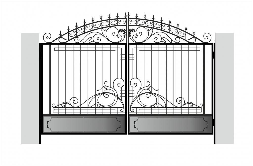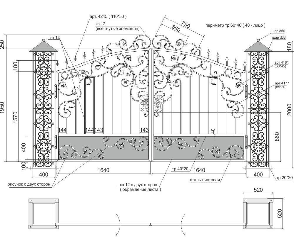 Первым делом составляются чертежи будущей конструкции. На них должны указываться габариты и форма створок. Форма может быть классической, в виде прямоугольника, либо иметь какую-то особую верхнюю линию. Схема также содержит расположение ребер жесткости, расстояния между ними и прочими элементами, расположение декоративных вставок. Если к воротам вплотную подходит забор, то указывается тип крепления ворот на ограждении. Часто в конструкциях предусматриваются железные калитки, вынесенные отдельно от основных створок. Калитки могут быть прозрачными или глухими.