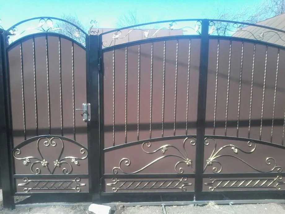 Помимо этого, ворота с коваными элементами выглядят изящно и богато. При этом можно использовать ковку на изделиях из дерева или поликарбоната, которые будут смотреться не хуже, чем из металлопрофиля.