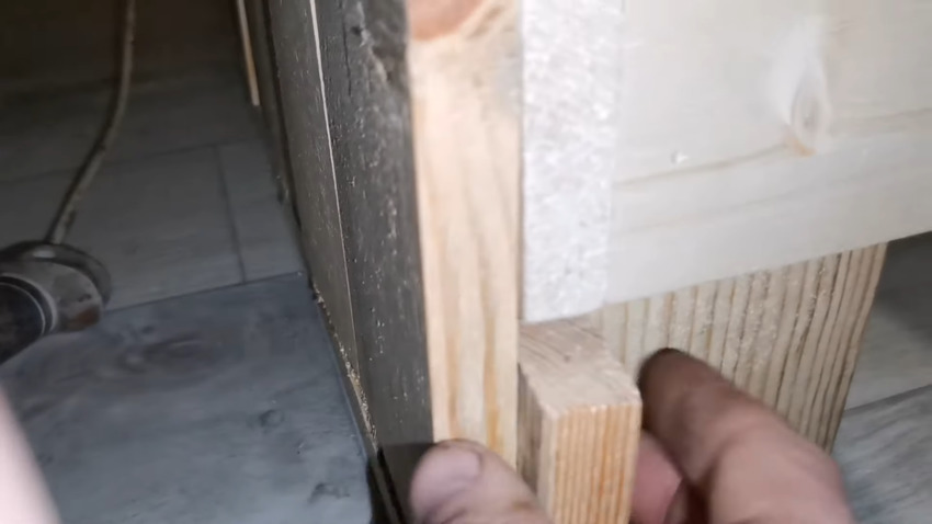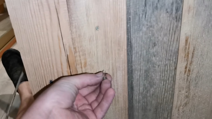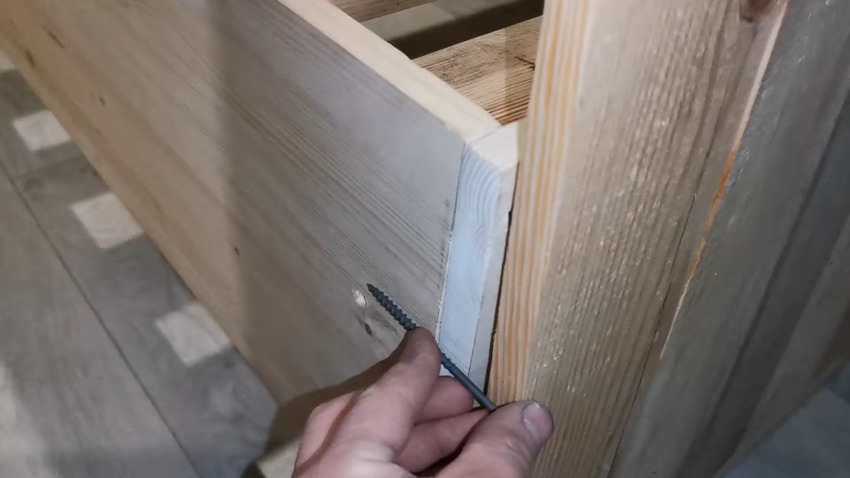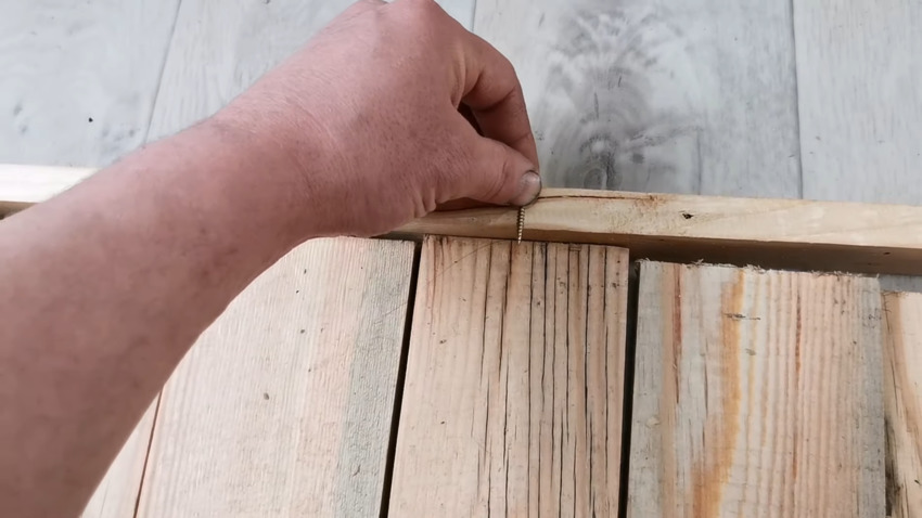 | 4 | ![]() | Обработанные доски приложите друг к другу, сверху расположите рейку. После этого подготовьте саморезы на 30 мм, которые нужно вкрутить в каждый деревянный брусок шуруповертом. |