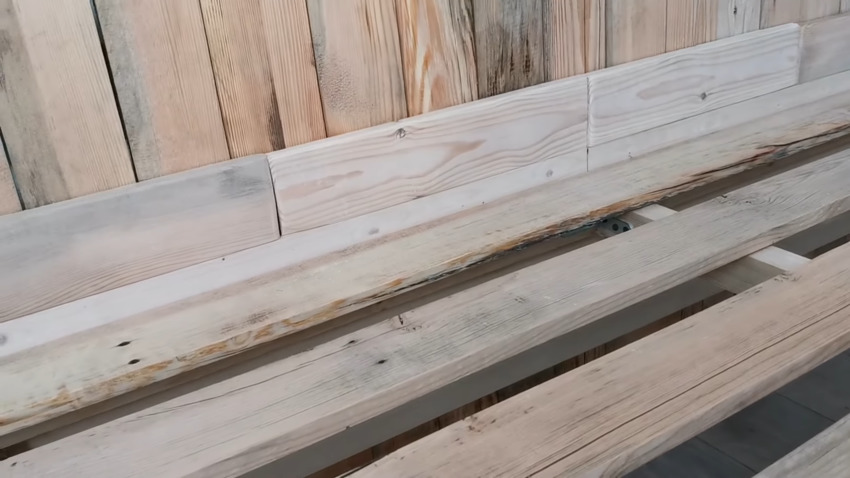 | 10 | ![]() | Далее измерьте длину получившегося изголовья и разделите на 4 равные части. Подготовьте 4 одинаковые доски от поддона, удалите из них гвозди при необходимости, обработайте электрорубанком, снимите фаски и зашкурьте механическим способом. Зафиксируйте их на нижней части изголовья короткими шурупами (30 мм), закручивая их шуруповертом сзади. |
