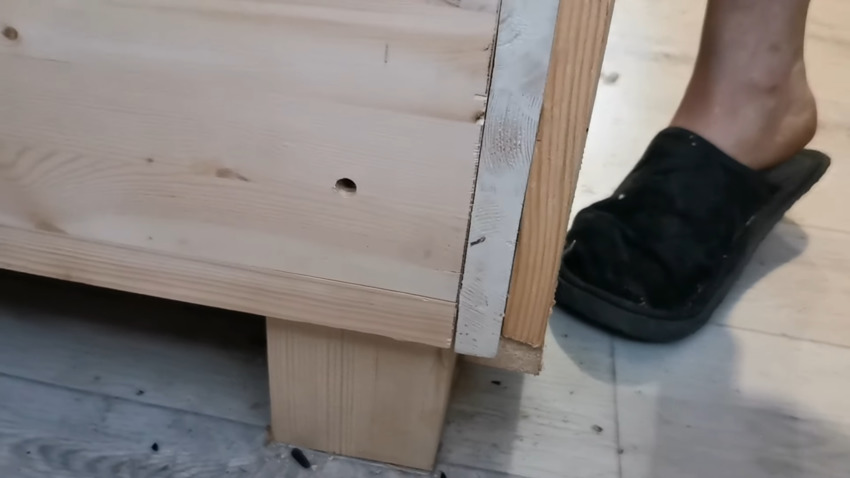 | 8 | ![]() | Щели, которые могут образоваться между ножкой и изголовьем, предварительно можно закрыть оставшимися брусками, вставив их в этот промежуток. Это поможет шурупам войти более плотно. |