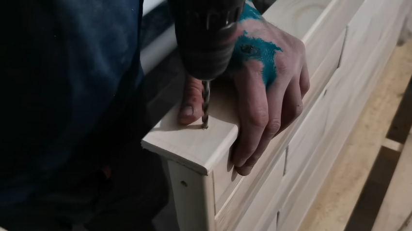 | 15 | ![]() | Далее закрепите верхнюю рейку тремя шурупами по всему периметру, предварительно также сделав углубления сверлом. Длина этой доски должна быть равной размеру изголовья. Углы и края длинных сторон рейки зашлифуйте, а отверстия с шурупами заполните шпаклевкой по дереву. |