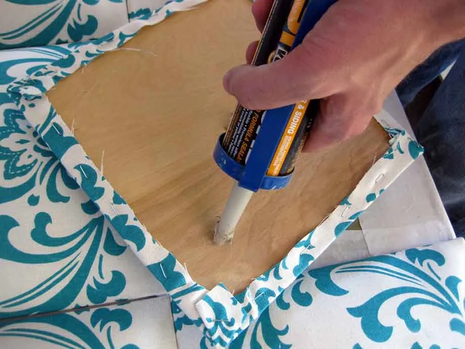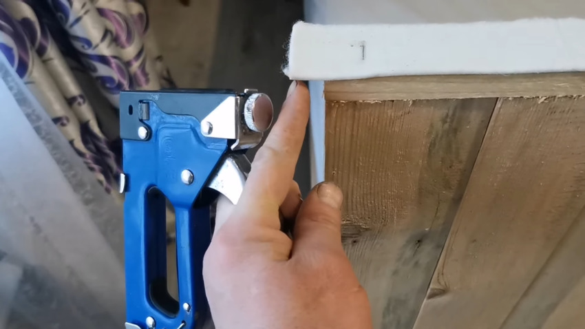 Заготовку обтягивают тканью, которую фиксируют с обратной стороны степлером