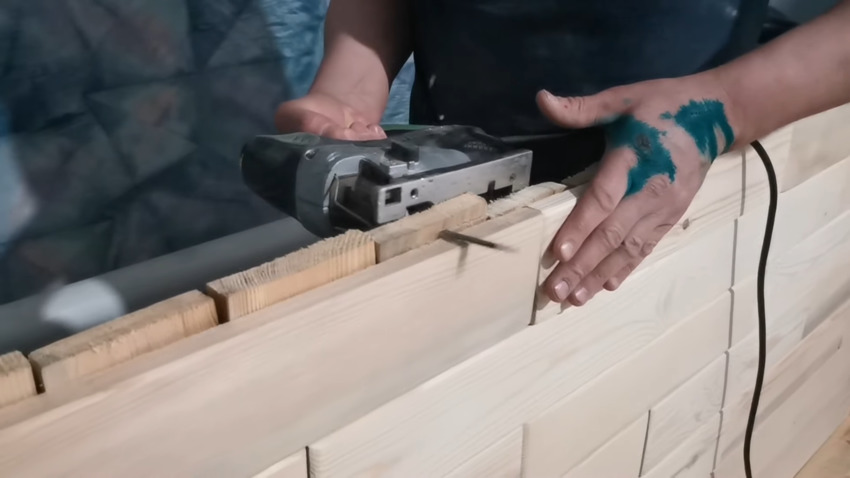 | 11 | ![]() | Подобным образом подготовьте оставшиеся доски подходящего размера для оставшейся части изголовья. Следующие ряды брусков закрепите в шахматном порядке, при необходимости распиливая доски пополам. |