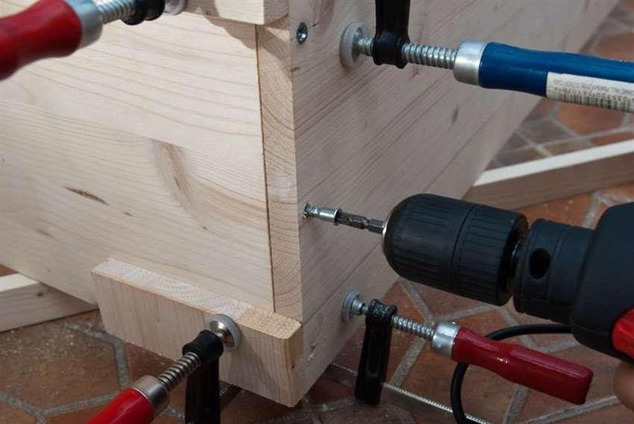 - Используя деревянные доски и листы фанеры, соберите ящики, соединяя их шурупами.