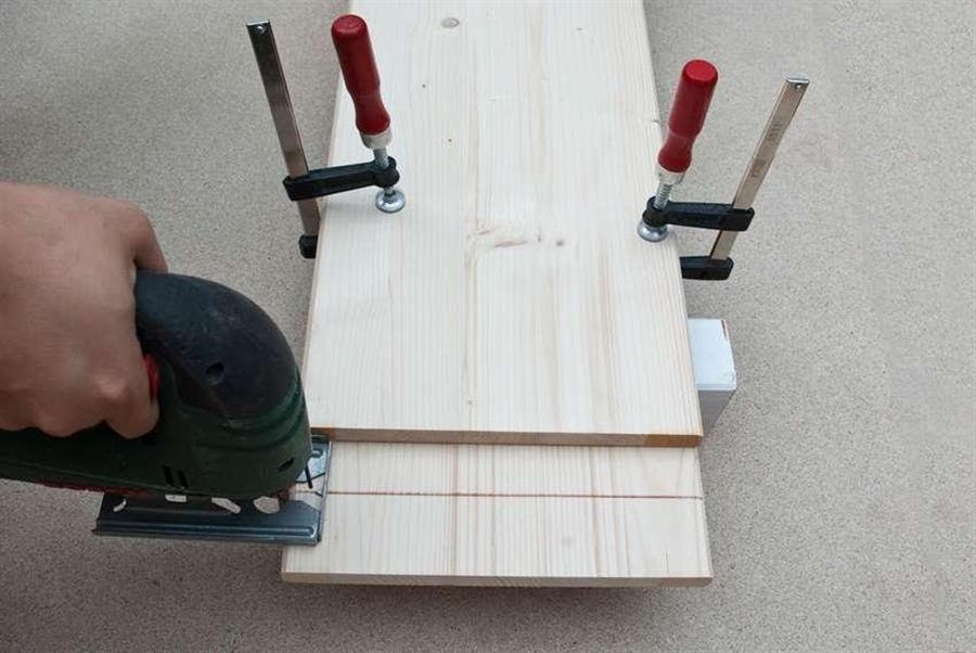 - С помощью пилы для дерева аккуратно разрежьте доски на необходимые части: основание, боковые стенки, переднюю и заднюю стенки.