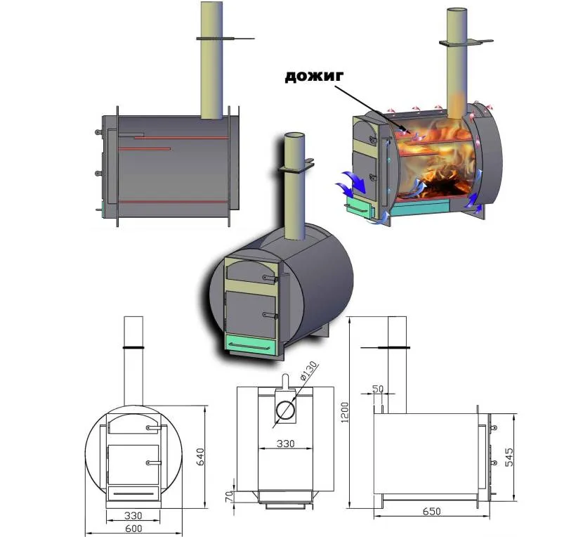 Это была общая инструкция того, как правильно сварить печь для бани из бочки. Таким нехитрым способом можно изготовить самодельную печку для бани с минимальными вложениями средств. Для более конкретных деталей конструкции следует ознакомиться с чертежами банной печи из металла.