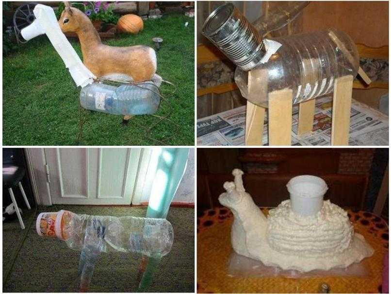 - Пластиковые бутылки. Из них можно сделать неплохие садовые фигуры, например, животных или цветы.