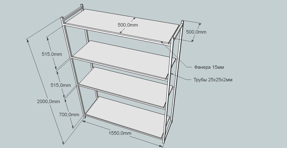 В качестве крепежа используют саморезы с пресс-шайбой. Они хорошо прижимаются к поверхности металла. Для полок понадобится фанера, доска или ОСП. Перед началом работы обязательно выполняют чертеж, который станет ориентиром в процессе сборки конструкции.